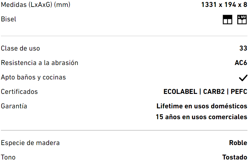 Un pavimento con un fácil mantenimiento, limpieza y con tecnología Durable, lo que nos permite presentar al mercado un suelo con las máximas garantías de durabilidad y buena conservación frente al paso del tiempo, siempre manteniendo todas las ventajas que nos ofrece la madera. Los suelos con tecnología Durable y clase 33 tienen una garantía LIFETIME en usos domésticos y 15 años en usos comerciales. La garantía para aplicaciones de baños y cocinas es de 10 años y se limita a instalaciones domésticas.