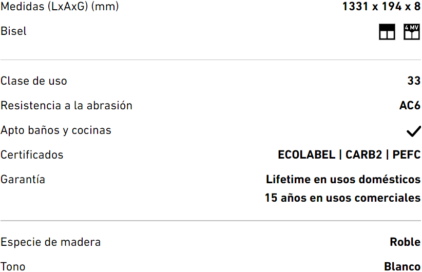 Un pavimento con un fácil mantenimiento, limpieza y con tecnología Durable, lo que nos permite presentar al mercado un suelo con las máximas garantías de durabilidad y buena conservación frente al paso del tiempo, siempre manteniendo todas las ventajas que nos ofrece la madera. Los suelos con tecnología Durable y clase 33 tienen una garantía LIFETIME en usos domésticos y 15 años en usos comerciales. La garantía para aplicaciones de baños y cocinas es de 10 años y se limita a instalaciones domésticas.