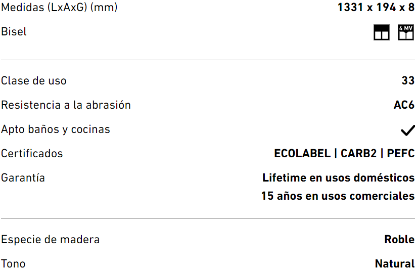 Un pavimento con un fácil mantenimiento, limpieza y con tecnología Durable, lo que nos permite presentar al mercado un suelo con las máximas garantías de durabilidad y buena conservación frente al paso del tiempo, siempre manteniendo todas las ventajas que nos ofrece la madera. Los suelos con tecnología Durable y clase 33 tienen una garantía LIFETIME en usos domésticos y 15 años en usos comerciales. La garantía para aplicaciones de baños y cocinas es de 10 años y se limita a instalaciones domésticas.