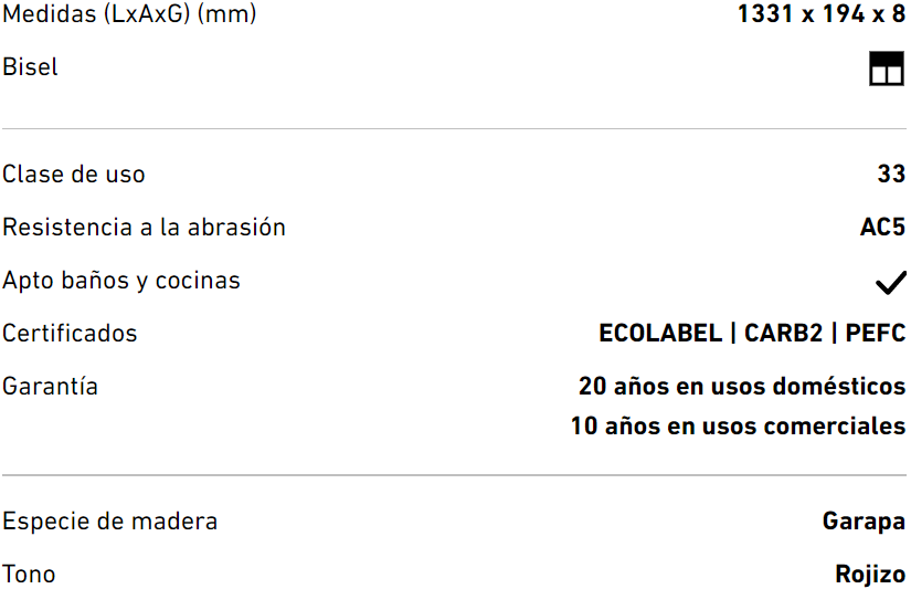 Un pavimento con un fácil mantenimiento y limpieza, muy resistente a los arañazos, los golpes y la humedad. Fabricado con materia prima sostenible y con los sellos de sostenibilidad más reconocidos. Destaca por alguna de sus características (grueso de 8 mm, resistencia a la abrasión AC5, protección antiestática, no propagador de fuego además de estar fabricado en tablero de HDF hidrofugo de una gran resistencia a los impactos IC3 con lo conseguimos una gran estabilidad dimensional) que son difíciles de encontrar en productos similares. Cuenta con la tecnología HIDROPROTECT que le confiere una gran resistencia a la humedad.