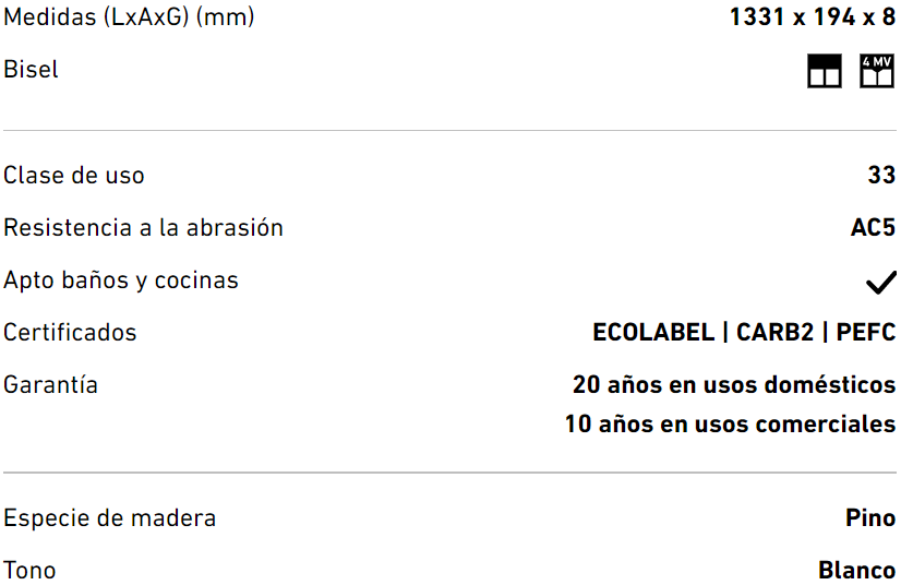 Un pavimento con un fácil mantenimiento y limpieza, muy resistente a los arañazos, los golpes y la humedad. Fabricado con materia prima sostenible y con los sellos de sostenibilidad más reconocidos. Destaca por alguna de sus características (grueso de 8 mm, resistencia a la abrasión AC5, protección antiestática, no propagador de fuego además de estar fabricado en tablero de HDF hidrofugo de una gran resistencia a los impactos IC3 con lo conseguimos una gran estabilidad dimensional) que son difíciles de encontrar en productos similares. Cuenta con la tecnología HIDROPROTECT que le confiere una gran resistencia a la humedad.