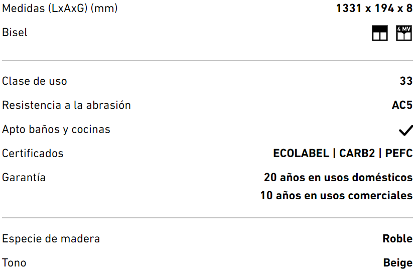Un pavimento con un fácil mantenimiento y limpieza, muy resistente a los arañazos, los golpes y la humedad. Fabricado con materia prima sostenible y con los sellos de sostenibilidad más reconocidos. Destaca por alguna de sus características (grueso de 8 mm, resistencia a la abrasión AC5, protección antiestática, no propagador de fuego además de estar fabricado en tablero de HDF hidrofugo de una gran resistencia a los impactos IC3 con lo conseguimos una gran estabilidad dimensional) que son difíciles de encontrar en productos similares. Cuenta con la tecnología HIDROPROTECT que le confiere una gran resistencia a la humedad.
