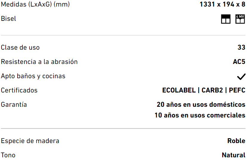 Un pavimento con un fácil mantenimiento y limpieza, muy resistente a los arañazos, los golpes y la humedad. Fabricado con materia prima sostenible y con los sellos de sostenibilidad más reconocidos. Destaca por alguna de sus características (grueso de 8 mm, resistencia a la abrasión AC5, protección antiestática, no propagador de fuego además de estar fabricado en tablero de HDF hidrofugo de una gran resistencia a los impactos IC3 con lo conseguimos una gran estabilidad dimensional) que son difíciles de encontrar en productos similares. Cuenta con la tecnología HIDROPROTECT que le confiere una gran resistencia a la humedad.