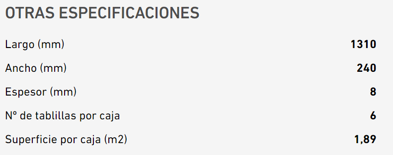 Unidades en el producto: Cantidad en cajas: Cada caja contiene 1.89 m²