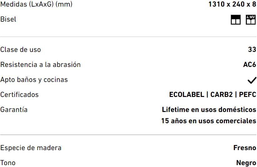 La colección destaca por su ancho de 24 cm y su estructura "sincronizada" consiguiendo un aspecto de madera natural. Con la tecnología DURABLE tenemos unos suelos de muy alta calidad que son fáciles de mantener y limpiar. Con una gran resistencia a los arañazos, los golpes y la humedad, gracias a su resistencia a la abrasión AC6. Ofrece garantía de por vida en uso doméstico y 10 años en baños y cocinas.