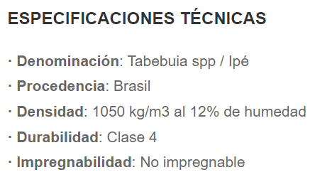 Tarima fabricada con madera maciza de Ipe. Esta tarima se emplea para un uso exterior en suelos o paredes de zonas ajardinadas y aguas como piscinas o balnearios. Se caracteriza por su alta resistencia y durabilidad (clase 4). El origen de esta madera es de tipo exótico, procedente de Brasil.